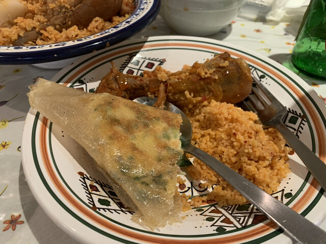 La maison de cous cous. 最後のチュニジア料理スペシャルメニューコース お1人様 ¥4500→¥3800 メザ 2つのカナペ 焼き野菜のペーストとホムス ブリック チュニジア春巻 スープ チュニジア風ピリ辛のガスパチョ(冷製トマト仕立スープ) はじめてのチュニジア料理。 ここはやはり一番チュニジアらしい料理が食べたい。 チュニジアのクスクスはモロッコのスタイルとはまた違う様相をみせてくれます。 モロッコではクスクスとスープは別々に出しますがチュニジアでは 蒸された クスクスに.
